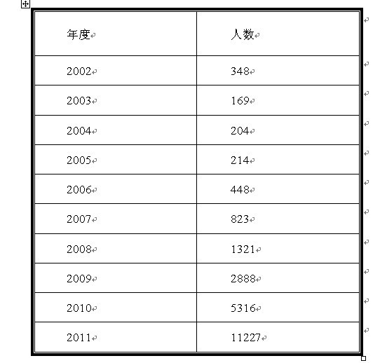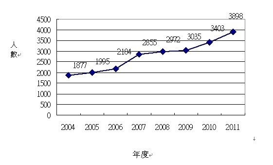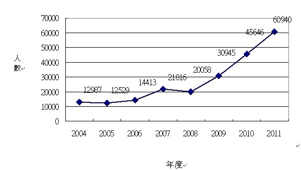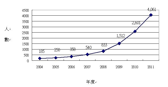 自2004年起至2011年为止,审查核准大陆文教专业人士来台总人次,共计有20余万人。每年人次如表三所示。