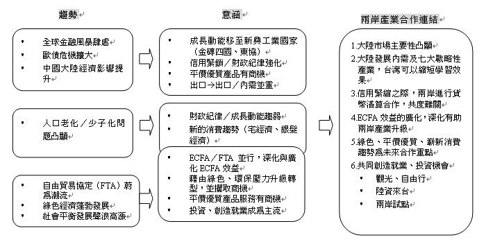 图1 全球经贸趋势变化、意涵及其对两岸产业合作的连结示意图