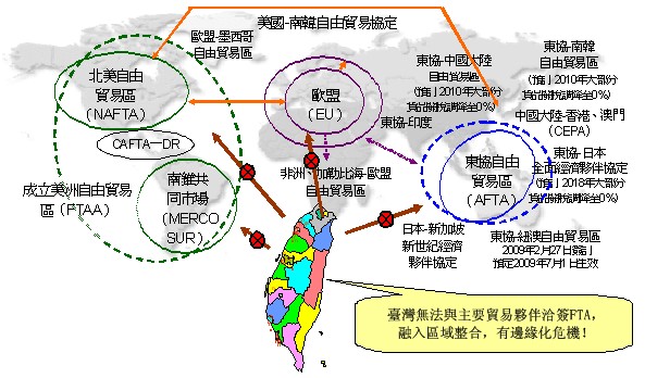 图2说明了在WTO杜哈回合陷入僵局下,签署贸易协议蔚为潮流,台湾必须积极加入FTA,以避免被边缘化。