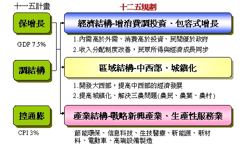 十二五规划期间是中国大陆企图改变国内外经济产业发展规律的明显转折点。就国际层面而言,中国大陆希望转变少数先进国家主导的国际经济格局,这反映在自主创新/产业标准、人民币国际化、与国际趋于同步发展新兴产业等方面。就其内部而言,中国大陆正面对国内多种结构性瓶颈或矛盾,重视经济、产业和社会层面的平衡发展。故政策上强调加速转变经济发展模式,重视调结构、扩内需、包容性增长、国民所得倍增。此外,面对中国大陆的崛起与十二五规划的发展方向,台湾必须因势利导有所作为,但也要谨慎以对。未来两岸经济与产业交流也势必要跳脱以往的基本思考方向与互动模式。未来,两岸产业与经济交流的演进应超越既有脉络与格局,要有新内涵,故需有“新思维”、“新伙伴关系”、“新合作模式”与“新治理架构”。