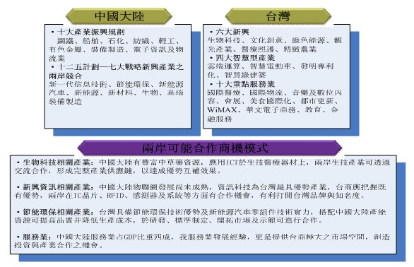 在两岸合作上,科技产业的对接合作、传统产业的升级转型,以及服务业质量的提升来扩大内需,均有合作的空间。但如何建立合作的机制,并透过ECFA的深化与广化,以及政策的松绑,才能落实两岸厂商、产业的合作,以因应挑战及开启新的商机。