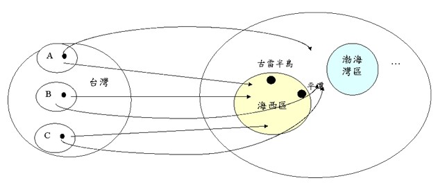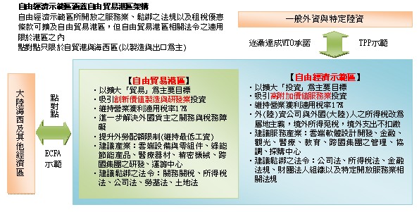 1.台湾的自由经济示范区可以一开始对应于海西区或渤海湾区等,但未来可扩大、延伸于大陆各区