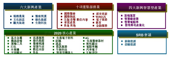 目前规划之六大新兴产业、十项重点服务业、四大新兴智能型产业及2020年规划之核心产业,主要方向请参见图10。