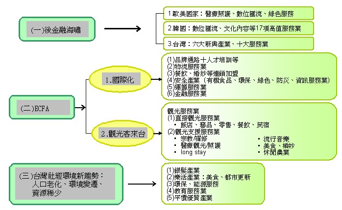 在新兴服务业上,后金融海啸、后ECFA及因应人口老化、环境变迁及资源稀少上,具潜力的服务业如图11所示。
