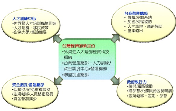 在新的商业模式上,台湾应发展为全球或亚太的人才培训中心、管理总部、台商营运总部等目标,并扮演外资进入大陆的经贸科技枢纽,台湾才能在产业全球布局之余,促成人才、资金、技术回流,进一步强化台湾的经贸科技优势,避免空洞化疑虑(见图13)。