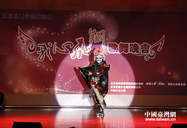 第六届中华文化快车——北京心灵呼唤艺术团7日晚间在台湾中国文化大学举办歌舞晚会,图为演员们表演川剧《变脸》。(中国台湾网 普燕 摄)