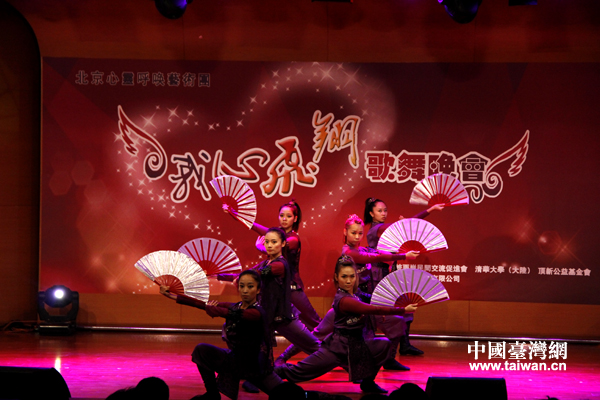 第六届中华文化快车——北京心灵呼唤艺术团7日晚间在台湾中国文化大学举办歌舞晚会。中国文化大学舞蹈系同学表演舞蹈《铁扇舞》。(中国台湾网 普燕 摄)