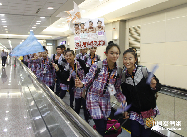 第六届中华文化快车--北京心灵呼唤艺术团交流团一行,10月5日飞抵台北,正式开启两岸中华文化交流台湾之旅。图为艺术团团员抵达桃园机场,难掩兴奋之情。(中国台湾网  普燕 摄)