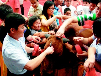 台南县祭孔最后拔智慧毛时,民众一拥而上,有名30多岁男子竟掏出小剪刀在牛头上连剪3、4次,将一撮撮牛毛放入口袋。有家长看见急着说:“智慧毛是要用拔的,孔夫子也不会认同用剪的。”另名家长说,如果不制止这种行为,以后他要将整条牛扛回家,也有人说明年带电动刮胡刀来。(高大林)