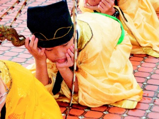 宜兰县孔庙祭孔活动,一名六佾舞舞生因跪太久了,索性用手撑着头,小憩片刻,忙里偷闲一番。来源:台湾《联合报》
