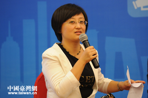 艾瑞咨询集团联合总裁邹蕾主持以“两岸携手共建全球市场核心竞争力”为主题的互动论坛。(中国台湾网 于斯文 摄)