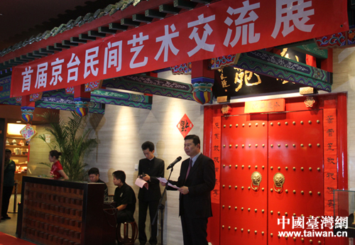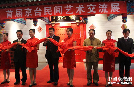 首届京台民间艺术交流展于2013年9月26日隆重开幕,北京市台办、北京市台联、中华青年企业家协会、北京大碗茶文化发展有限公司、北京老舍茶馆有限公司的领导和嘉宾出席剪彩仪式。(中国台湾网 杨永青 摄)