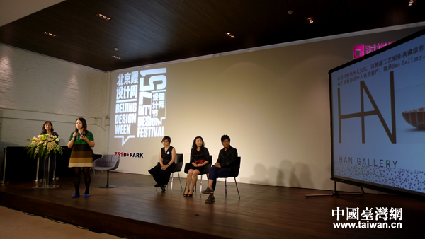 2013北京国际设计周26日开幕,来自台湾的10家原创设计品牌首次以专馆形式在北京751设计广场亮相。图为台湾馆发布会现场,台湾参展者回答现场媒体提问。(中国台湾网 李徽 摄)