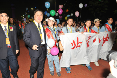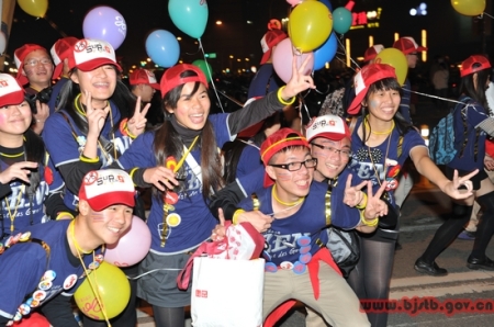 北京市台办副主任高振生、交流处副处长尹振东和北京学生一起参加走街活动(邢庆 摄)