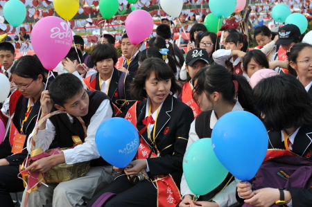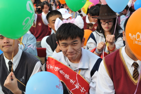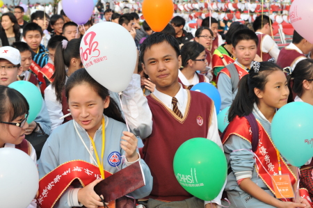 台湾忠信学校的学生与北京市第八中学的学生在活动现场(邢庆 摄)