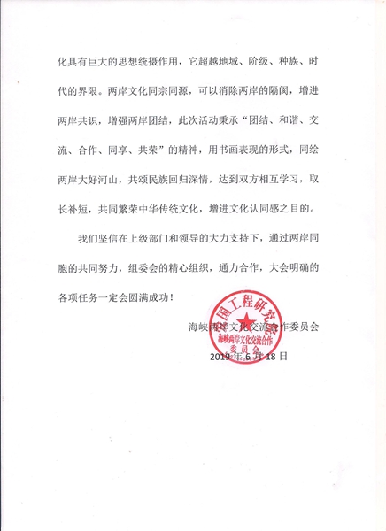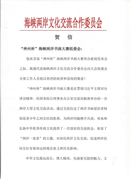 海峡两岸文化交流合作委员会向书画大赛组委会发来贺信