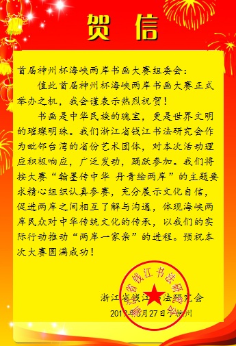 浙江省钱江书法研究会向大赛组委会发来贺信