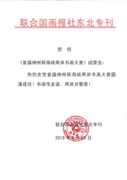 中国台湾网6月25日讯 由九州文化传播中心、福建省广播影视集团等多家单位主办的《首届“神州杯”海峡两岸书画大赛》活动日前启动,联合国画报社东北专刊向大赛组委会发来贺信。