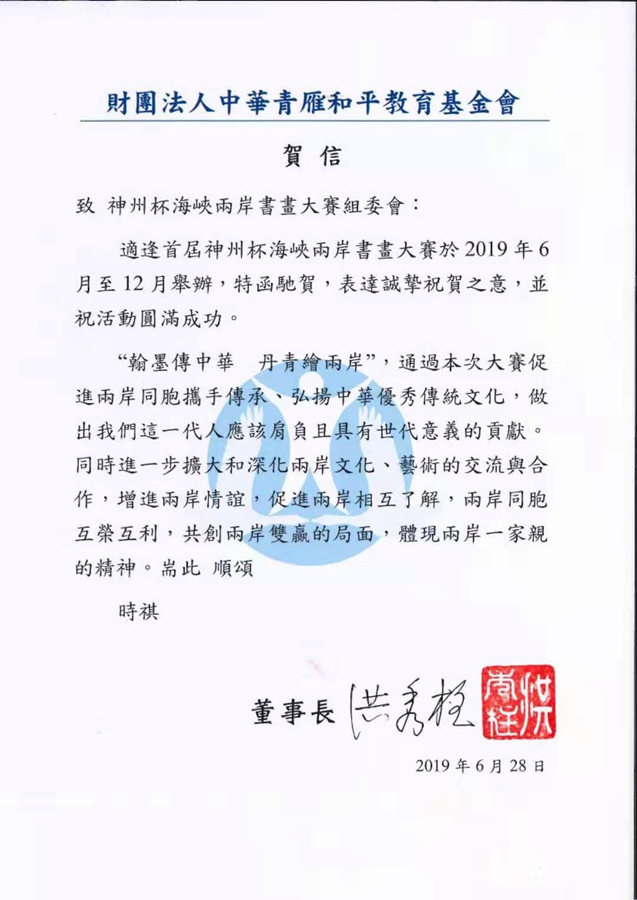 中国台湾网7月1日讯 由九州文化传播中心、福建省广播影视集团等多家单位主办的《首届“神州杯”海峡两岸书画大赛》活动日前启动,财团法人中华青雁和平教育基金会向大赛组委会发来贺信。