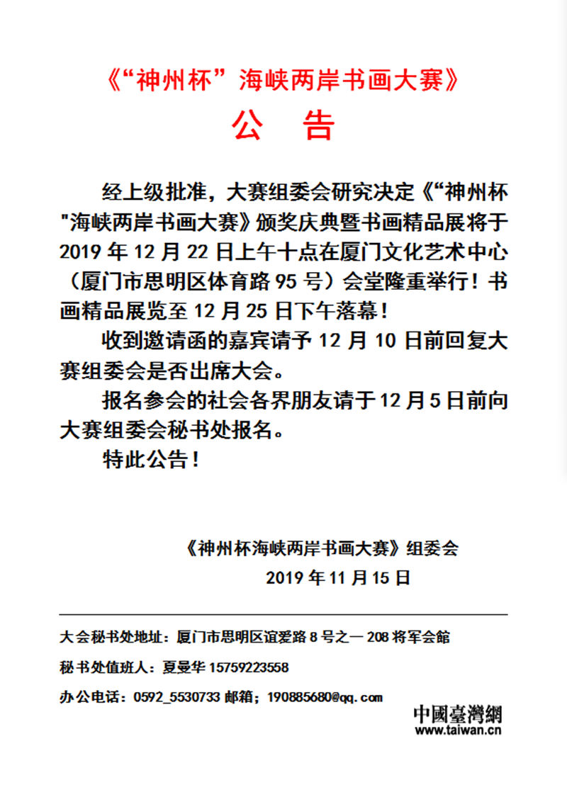 《“神州杯”海峡两岸书画大赛》公 告