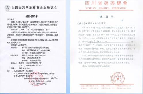 2009年8月10日,全国台企联向会员发倡议书,为“莫拉克”风灾受灾的台湾同胞献爱心(左)。2013年4月,全国台企联收到的四川省慈善总会的感谢信(右)。