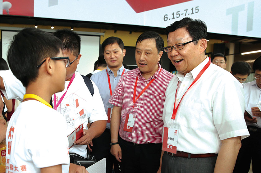 2016年8月1日,海协会会长陈德铭在上海出席海峡两岸首届青年创客大赛并与参赛选手亲切交谈。