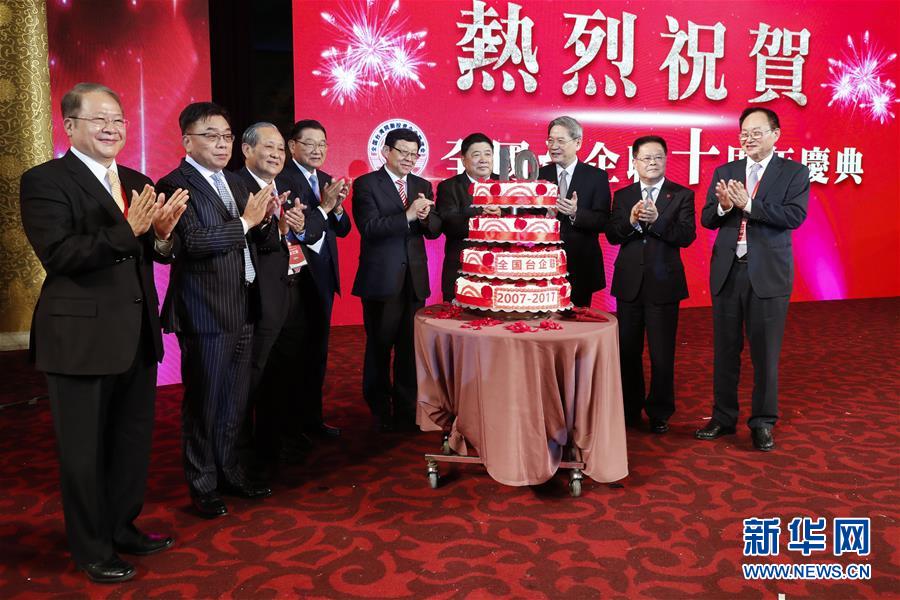 2017年5月24日,全国台企联成立十周年庆典晚会在京举办。当日,中共中央台办、国务院台办主任张志军(右三)、海峡两岸关系协会会长陈德铭(左五)、全国台企联会长王屏生(右四)、台湾三三会会长江丙坤(左四)等出席庆典晚会。当日,全国台湾同胞投资企业联谊会成立十周年庆典晚会在北京饭店举行。 新华社记者沈伯韩摄